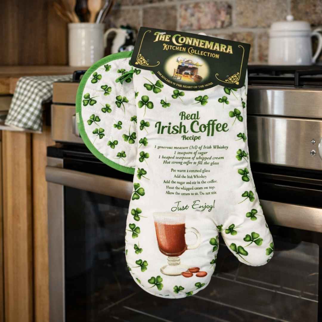 This Irish coffee kitchen set is a perfect accessory for your home. From the Connemara Kitchen the Oven Mitt is decorated with a shamrock illustration.