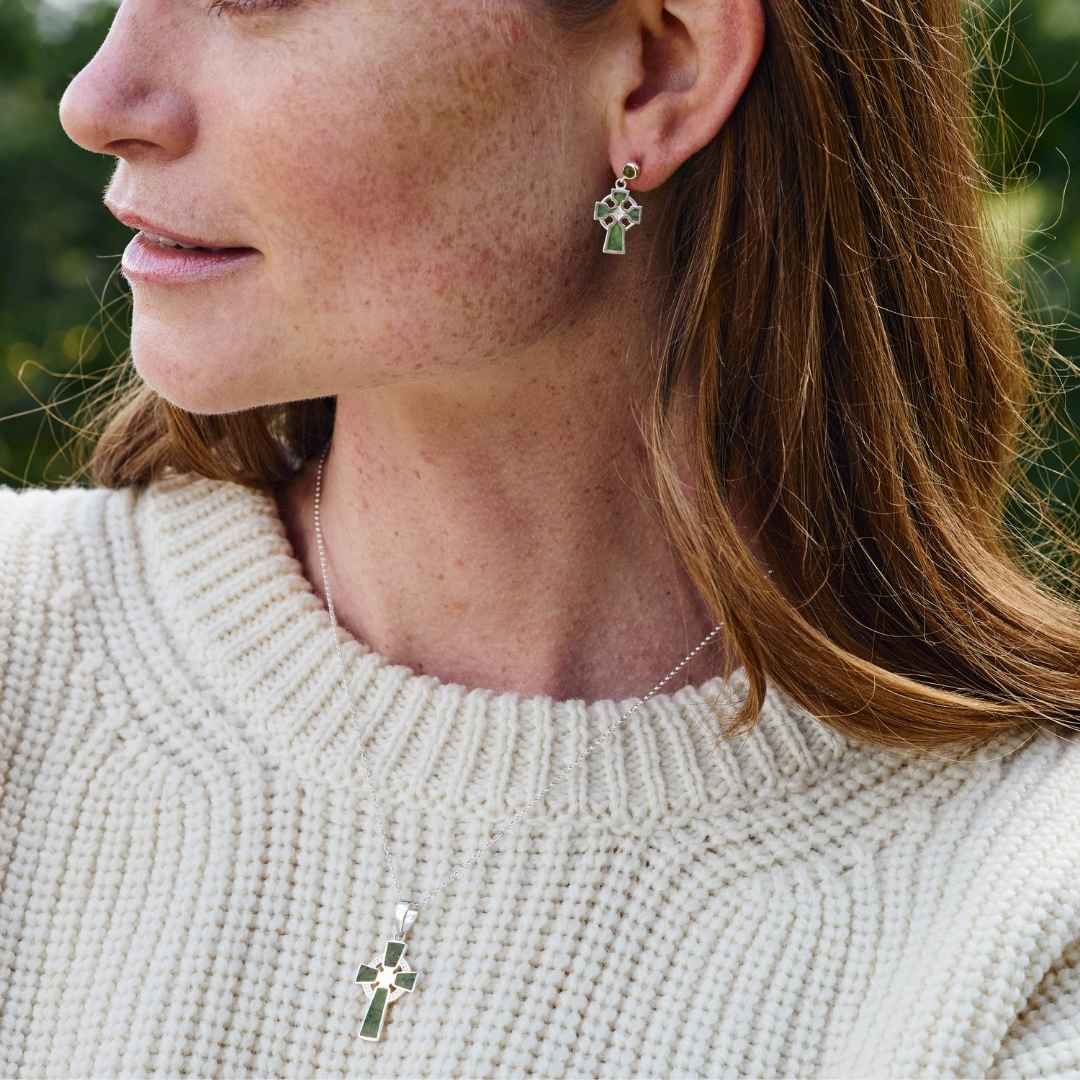 Connemara Marble Celtic cross necklace with earrings. Presented in a hinged gift box with certificate of authenticity.