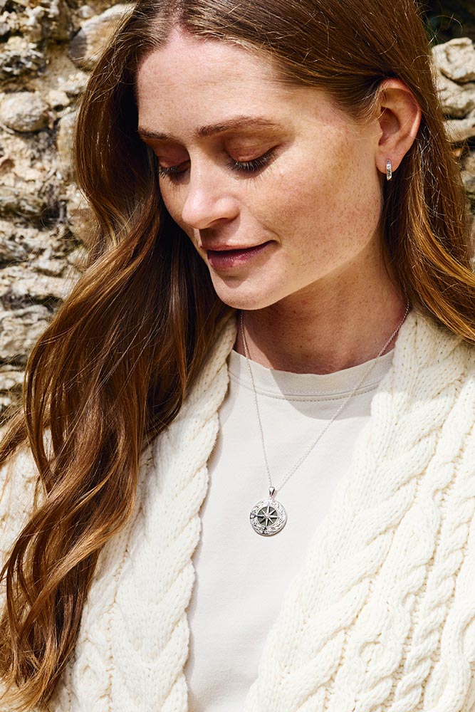 Inspired by the timeless symbolism of the compass, this beautifully crafted pendant represents guidance, protection, and the reassurance of always finding your way. Handcrafted in Ireland from hallmarked sterling silver and set with genuine Connemara Marble, it is a contemporary piece deeply rooted in history.