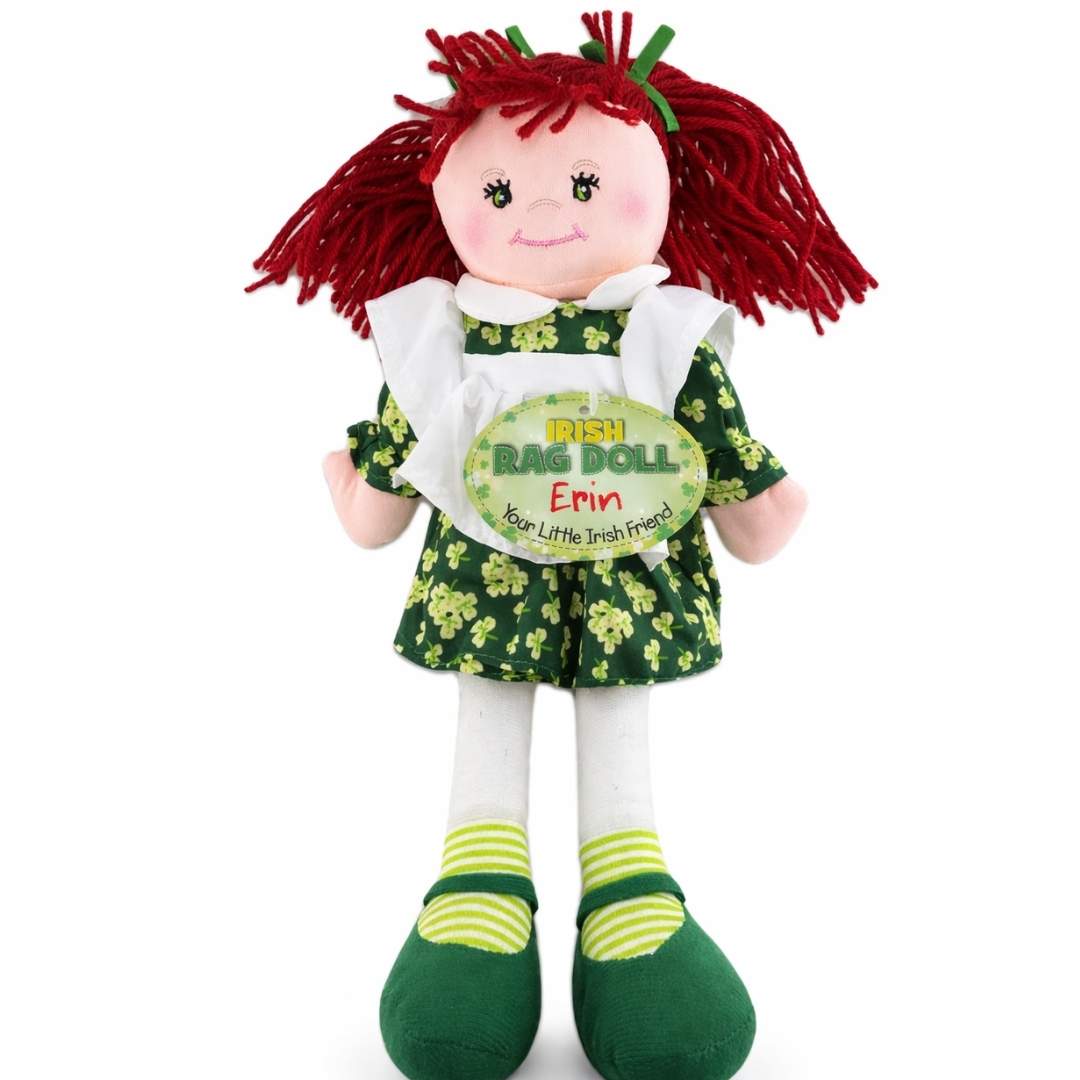 Bring a little Irish charm into your home with the Irish Rag Doll Erin, a delightful plush doll full of personality and traditional Irish style. With her bright red yarn hair, cheerful embroidered smile, and adorable shamrock dress, Erin is the perfect companion for children or a charming collectible for anyone who loves Irish culture.