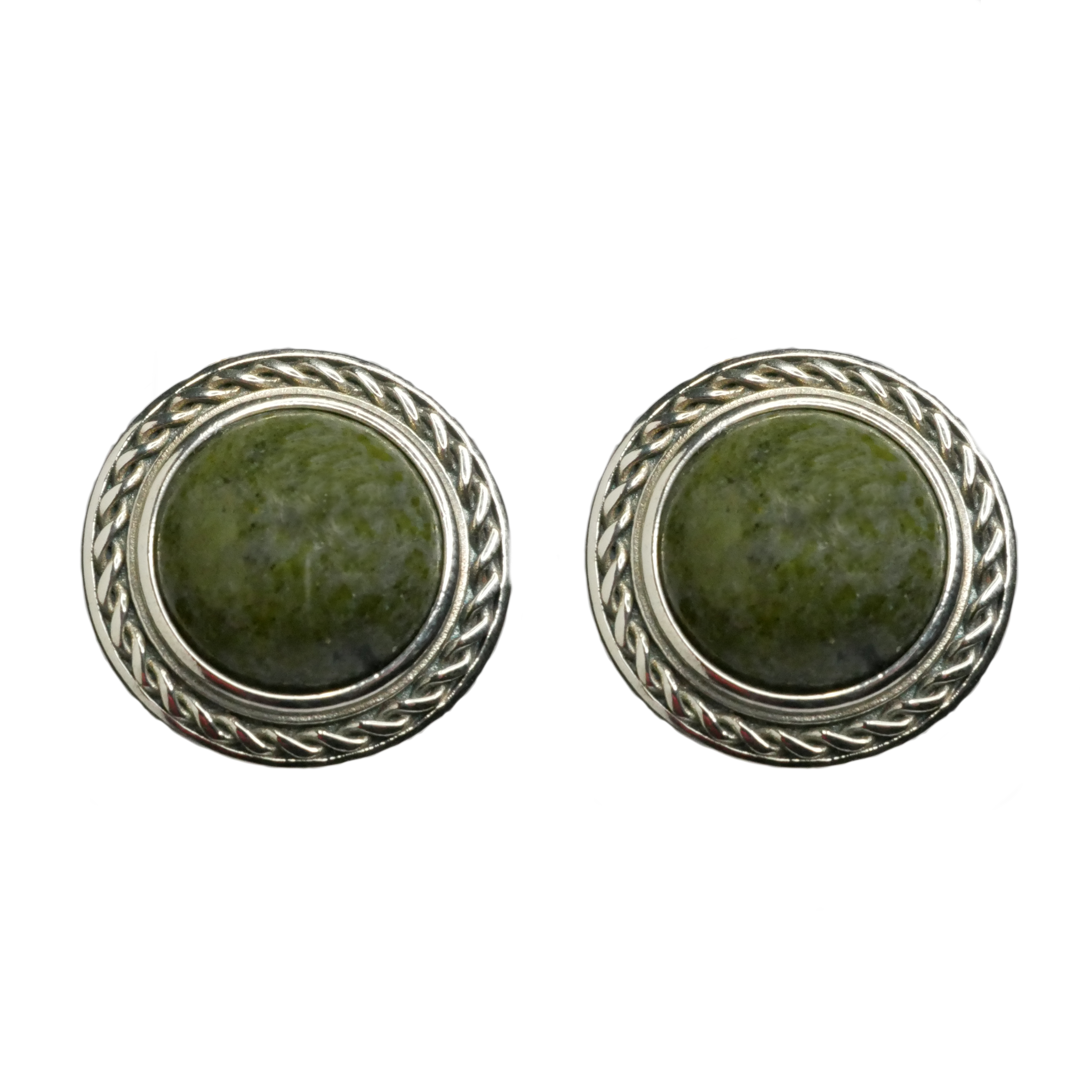 Each earring features a round cabochon of genuine Connemara marble. Dating over 900 million years this precious gem is hand lifted from our own family quarry in Lissoughter, Co Galway.
