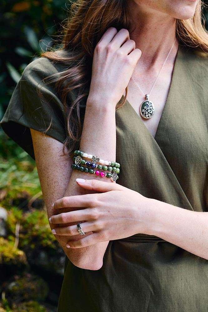 The shamrock is a universal symbol of good luck, good health, and happiness. Paired with elegant freshwater pearls and 8mm beads of genuine Connemara Marble, hand-lifted from our family quarry in Lissoughter, Co. Galway this bracelet is associated with serenity, grounding, and a deep connection to the earth.