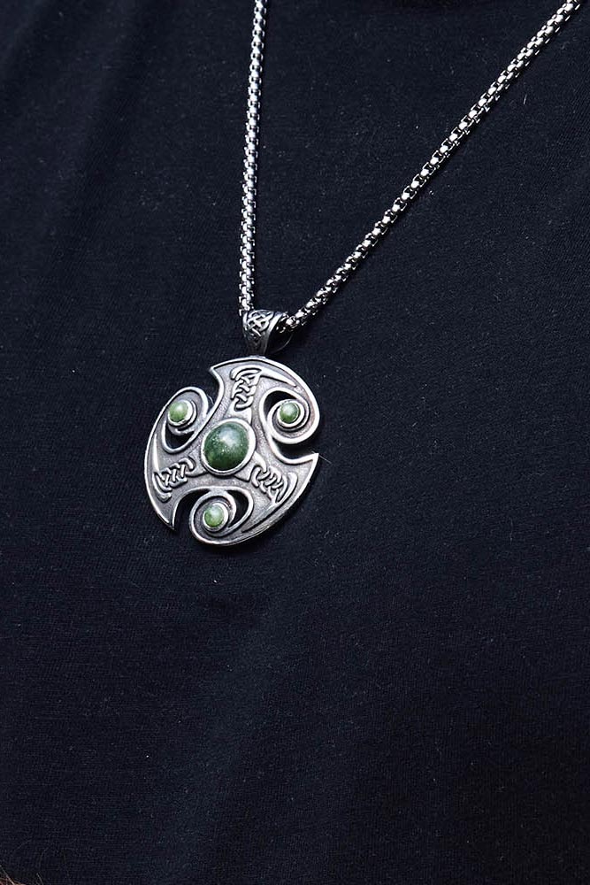 This striking pendant represents a powerful blend of Viking and Celtic heritage, symbolizing strength, resilience, and a deep connection to nature. At its heart sits genuine Connemara Marble, Ireland’s national gemstone, linking the wearer to the ancient landscapes and rich history of the west of Ireland. Set within a sleek stainless steel frame, the natural green marble creates a bold yet timeless statement.